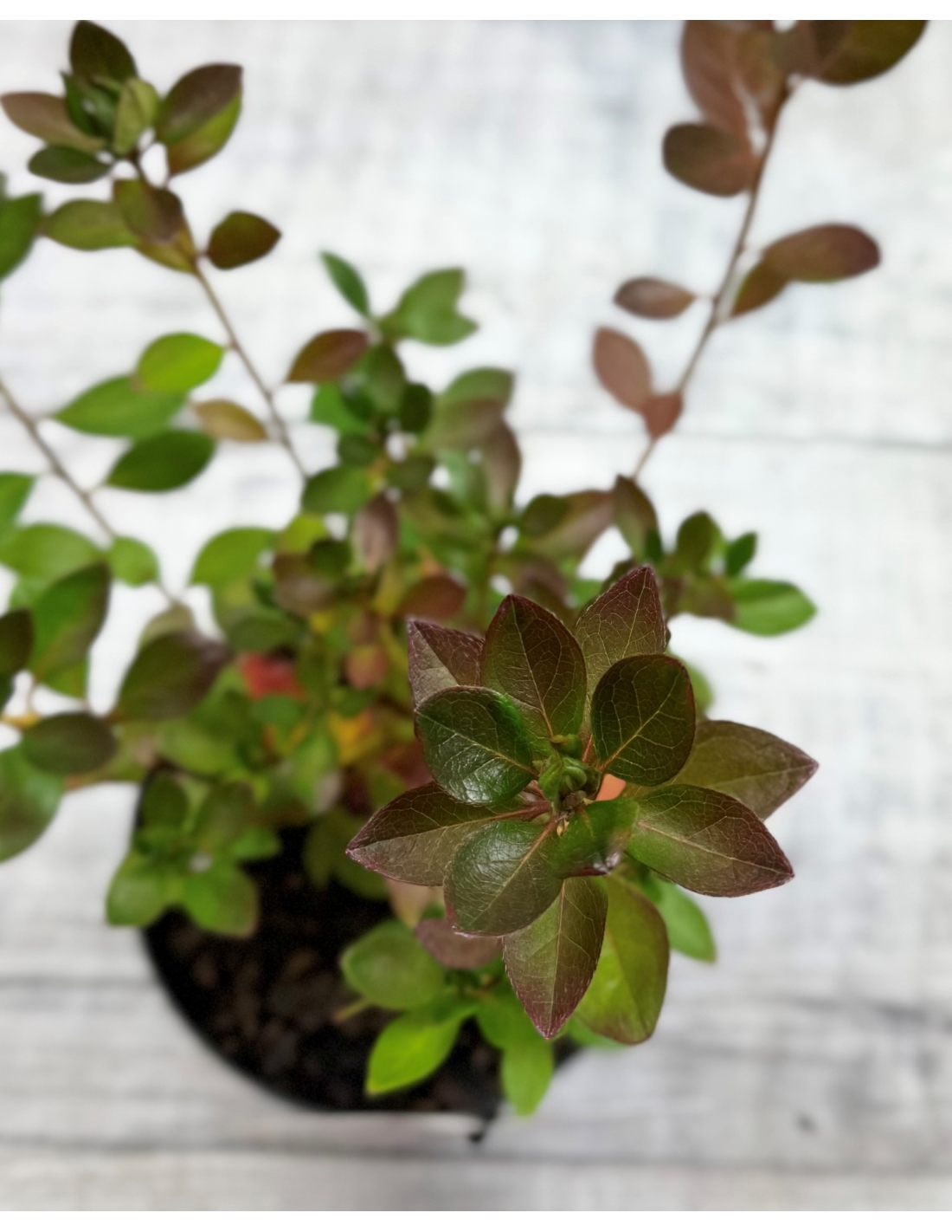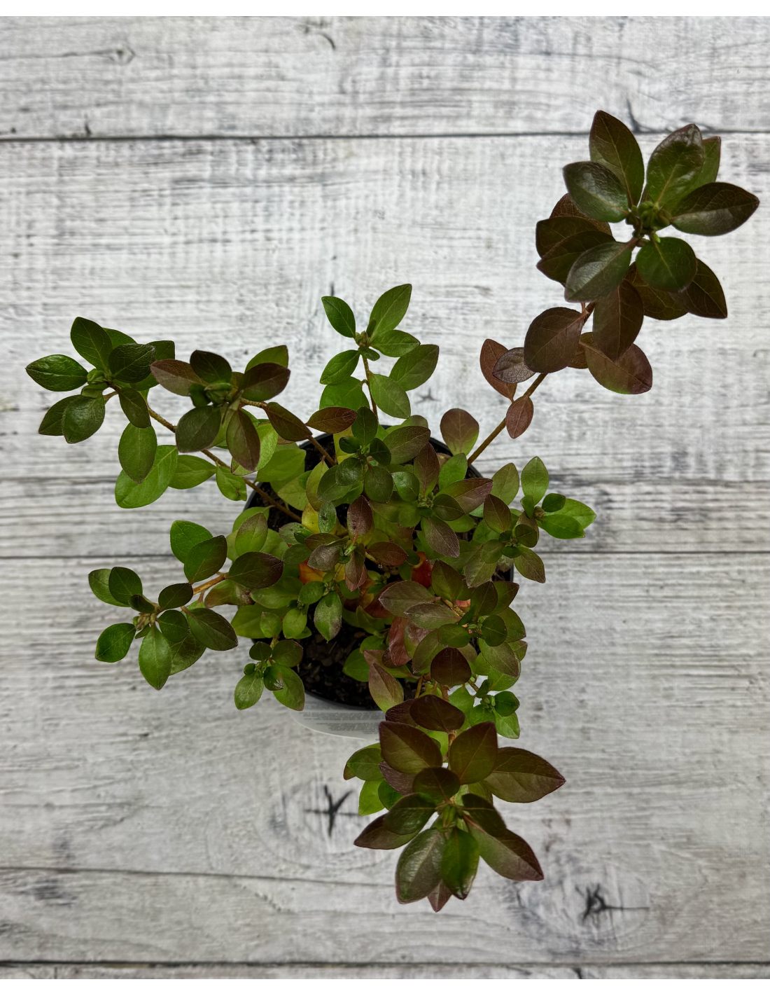 Liście są półzimozielone, ciemnozielone i błyszczące, o kształcie jajowatym i długości 2–3 cm. Jesienią mogą delikatnie przebarwiać się na czerwonawy odcień, zachowując część ulistnienia przez zimę.