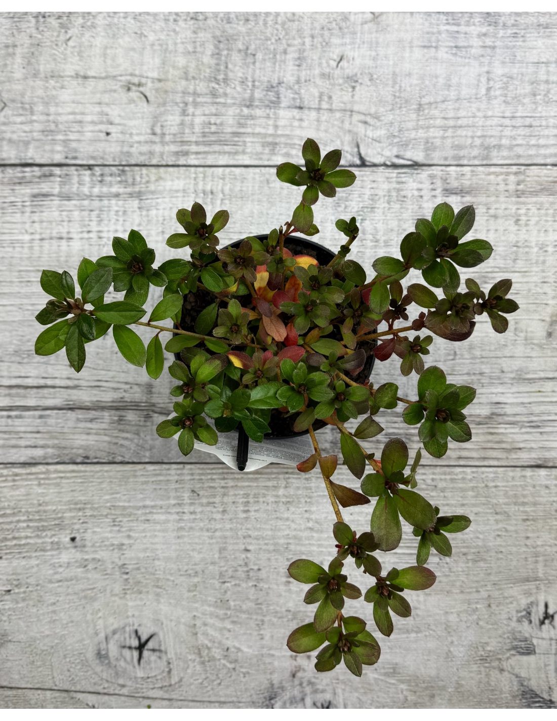 Liście są półzimozielone, jajowate, ciemnozielone, młode pędy lekko owłosione.