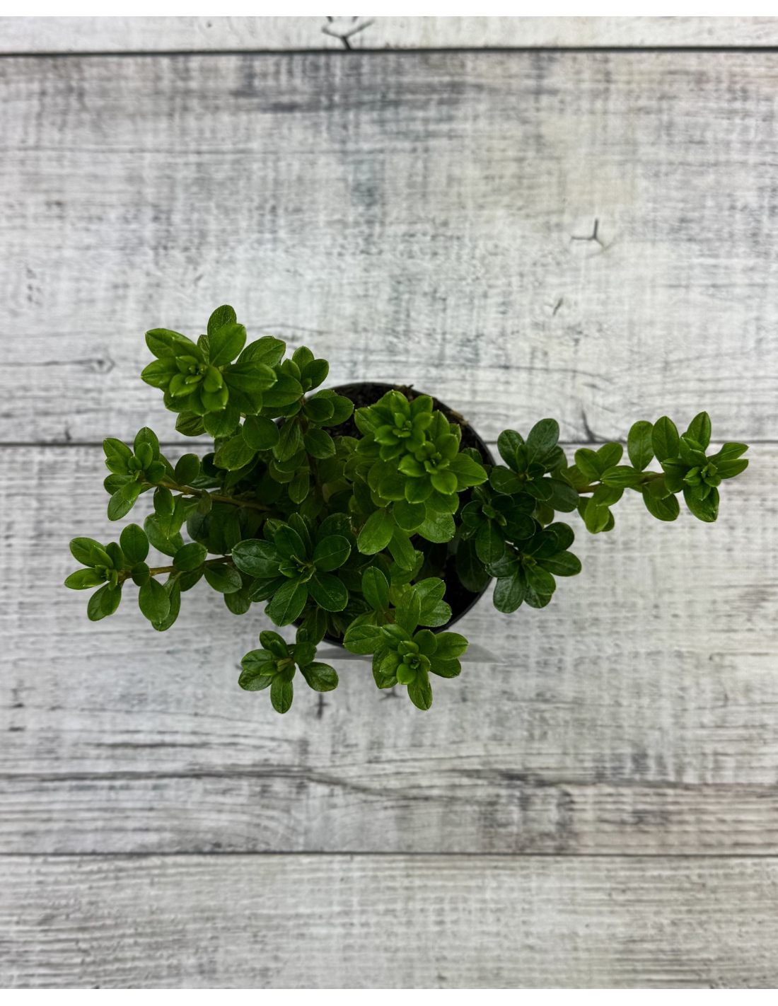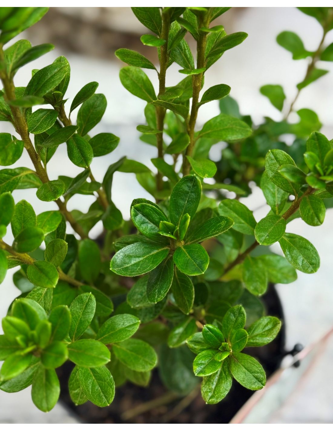 Po około 10 latach krzew osiąga zwykle 0,3–0,4 m wysokości i około 0,5 m szerokości, zachowując kompaktowy, harmonijny kształt. Liście są dwusezonowe, bardzo małe (1–3 cm długości), ciemnozielone i delikatnie błyszczące, co nadaje roślinie subtelny, zimozielony charakter przez cały sezon.