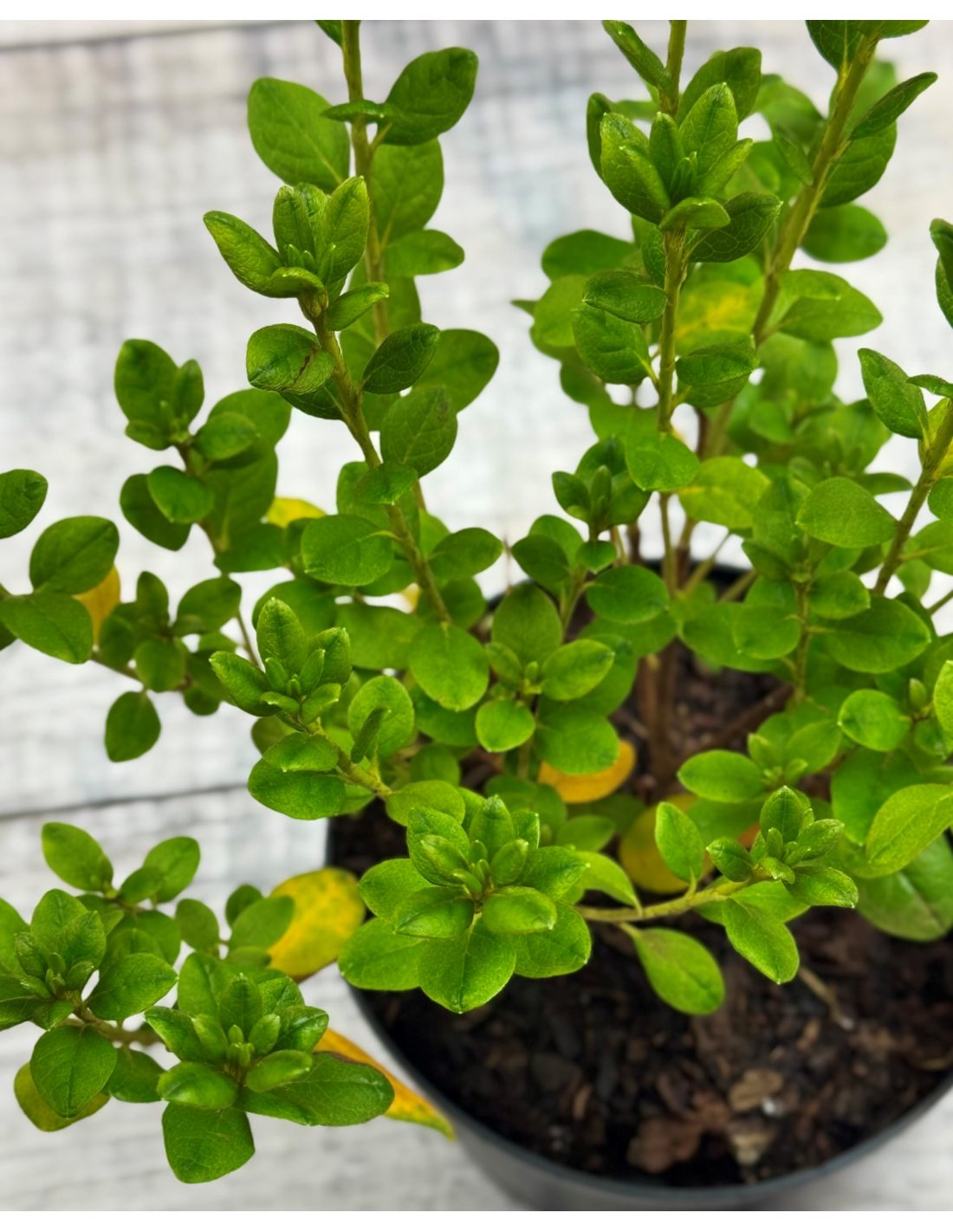 Liście są jasnozielone, skórzaste i błyszczące, o długości do 3 cm. W okresie jesienno-zimowym zmieniają barwę na czerwonobordową, pozostając na roślinie przez całą zimę, co dodatkowo zwiększa jej walory ozdobne.