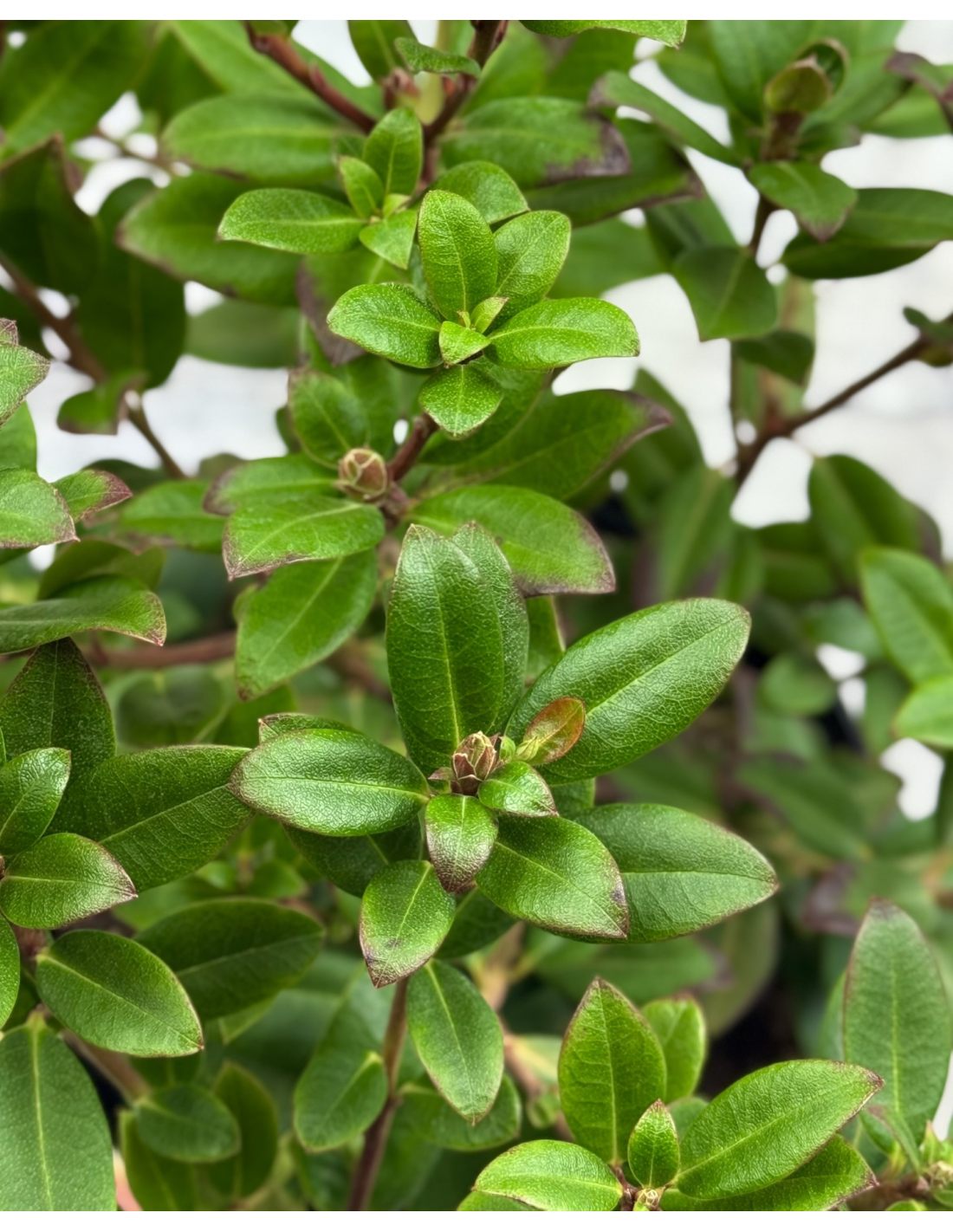 Liście są jasnozielone, drobne i lekko błyszczące, o długości do 2,5 cm. Młode przyrosty mają delikatnie brązowawy odcień, który jesienią powraca, nadając roślinie ciepły, dekoracyjny wygląd.