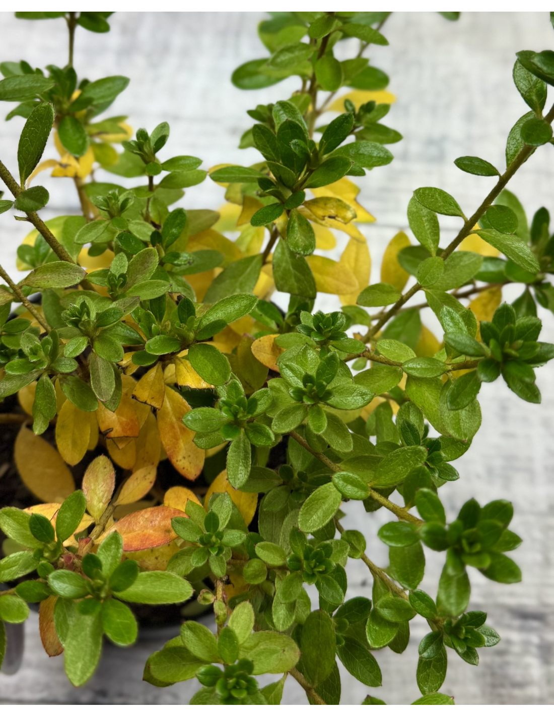 Liście są dwusezonowe, ciemnozielone i trwałe, utrzymujące się na krzewie także zimą, nadając roślinie dekoracyjny wygląd przez cały rok.
