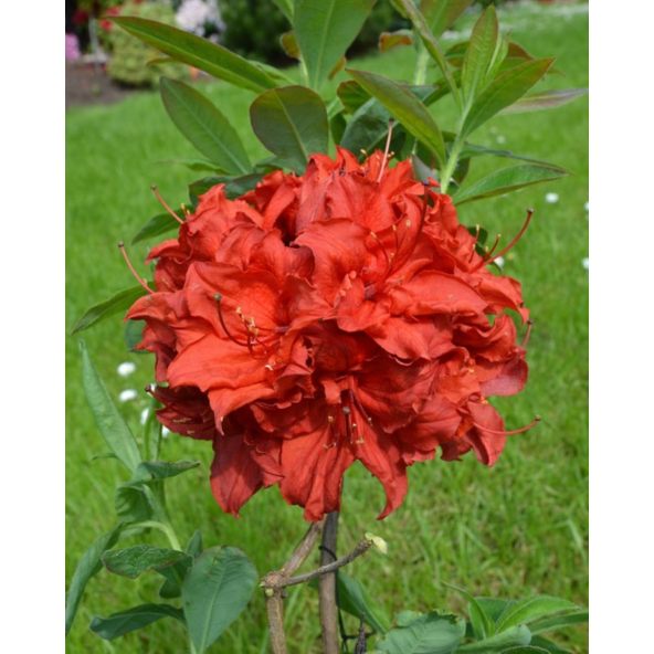Największą ozdobą tej odmiany są duże, intensywnie ciemnoczerwone kwiaty o średnicy 5–6 cm, z delikatnie jaśniejszym górnym płatkiem i białymi, kontrastującymi pręcikami. Kwiaty nie bledną w pełnym słońcu, co jest rzadkością wśród czerwonych azalii. Zebrane są po kilka sztuk w kuliste, wierzchołkowe kwiatostany, tworząc zachwycający, ognisty efekt barwny.