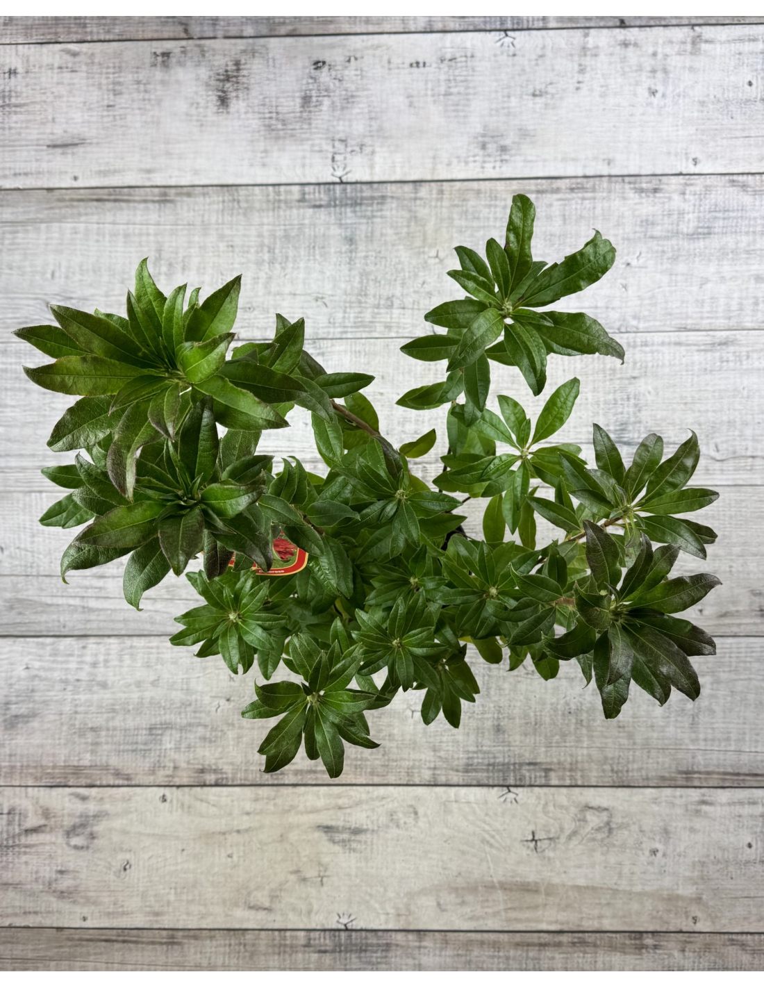 Krzew charakteryzuje się zwartym, rozłożystym pokrojem i umiarkowaną siłą wzrostu. Po 10 latach osiąga około 1 m wysokości i 1,2 m szerokości, tworząc gęstą, elegancką sylwetkę. Liście są ciemnozielone, błyszczące, o szeroko eliptycznym kształcie. Młode przyrosty mają brązowawy odcień, a jesienią przebarwiają się dekoracyjnie na czerwono.