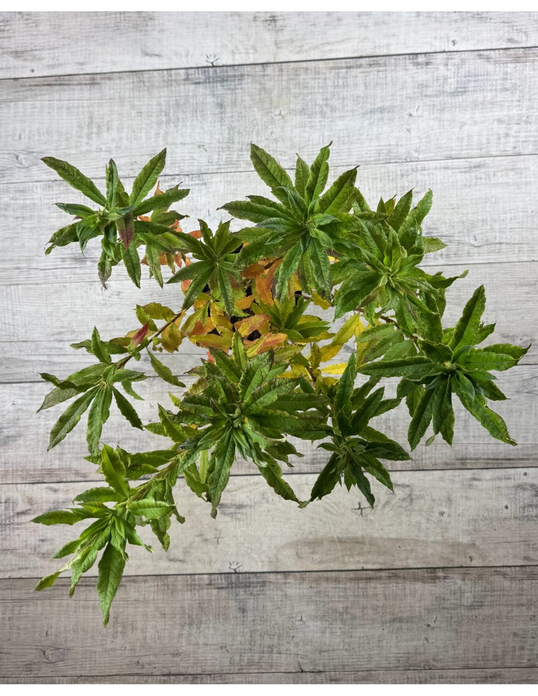 Krzew charakteryzuje się zwartym, wyprostowanym pokrojem, z wiekiem przybierającym nieco zaokrąglony kształt. Rośnie umiarkowanie szybko – po 10 latach osiąga ok. 0,9 m wysokości i 0,6 m szerokości, a docelowo dorasta nawet do 2,5 m. Liście są sezonowe, jasnozielone, wąsko eliptyczne, długości do 7 cm, jesienią efektownie przebarwiają się na czerwono, wprowadzając do ogrodu ciepłe, jesienne barwy.