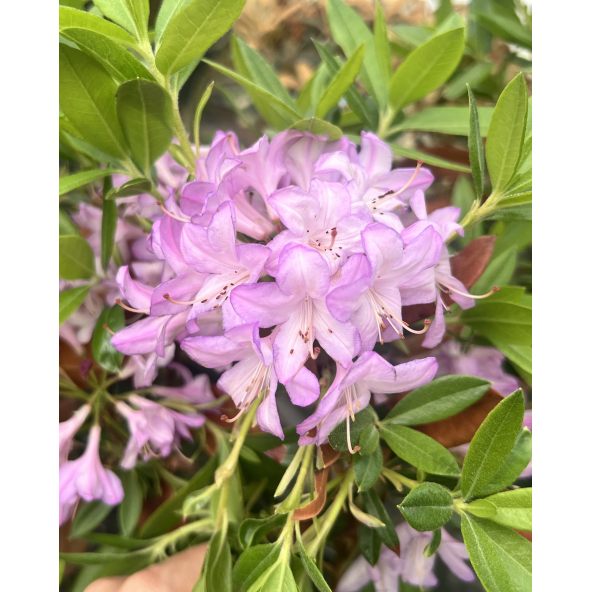 Kwiaty są wyjątkowo urokliwe i pachnące – fioletowo-lawendowe do lilioworóżowych, z delikatnymi, brązowawymi cętkami na górnym płatku. Choć niewielkie (2,5–3,5 cm średnicy), wyróżniają się niezwykłą obfitością – zebrane są po kilkadziesiąt (nawet 36–48) w duże, niemal kuliste kwiatostany, które efektownie pokrywają wierzchołki pędów. Kwiaty mają przyjemny, intensywnie słodki zapach, wyczuwalny z daleka. Kwitnienie przypada na pierwszą połowę czerwca, czyli nieco później niż u większości azalii.