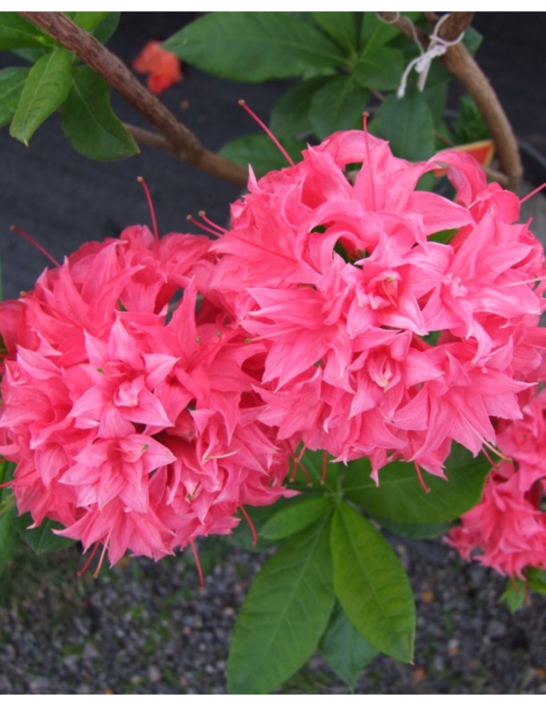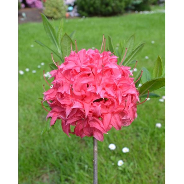 Największą ozdobą tej odmiany są jej gęste, kuliste kwiatostany, które przypominają pompony. Każdy z nich składa się z 12–16 półpełnych, gwiaździstych kwiatów o intensywnie karminoworóżowej barwie. Płatki są delikatnie pofalowane, co nadaje kwiatom lekkości i subtelnego wdzięku. Pojedyncze kwiaty mają średnicę około 3–4 cm, a kwitnienie przypada na koniec maja i początek czerwca. Azalia ‘Homebush’ kwitnie niezwykle obficie, tworząc zachwycające, różowe kule kwiatów pokrywające cały krzew.