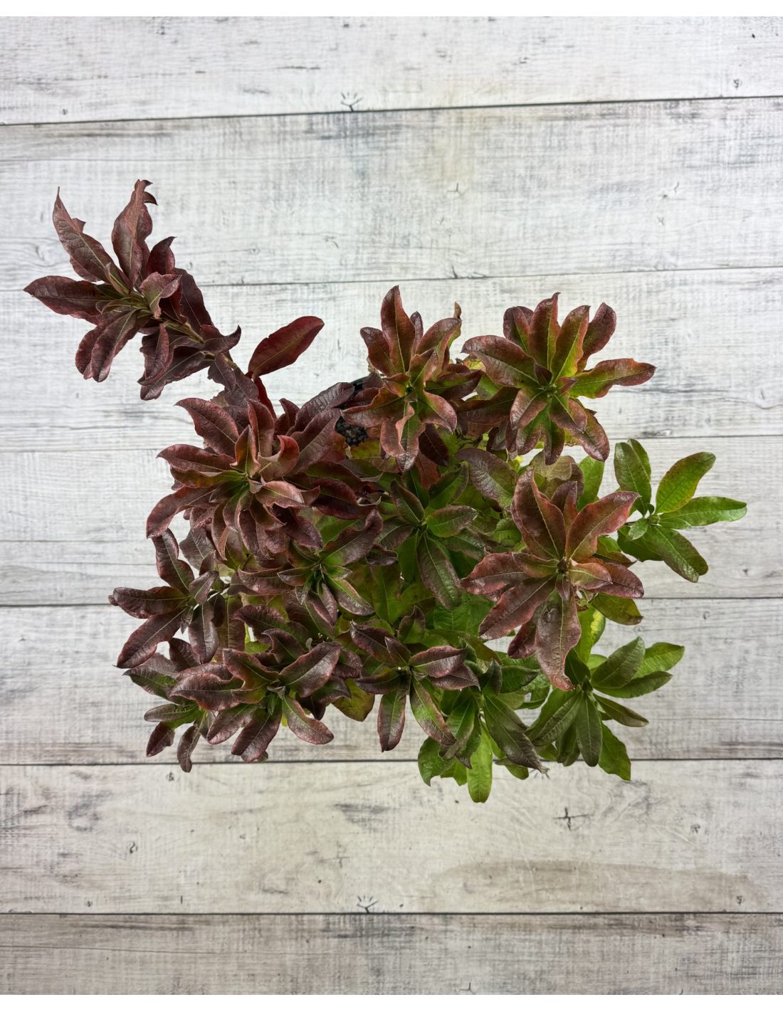Krzew ma pokrój wzniesiony, dość zwarty i rozłożysty, osiąga po 10 latach ok. 1,2 m wysokości i 1,4 m szerokości. Rośnie umiarkowanie, zachowując regularny kształt. Liście sezonowe są duże, do 11 cm długości, ciemnozielone, a jesienią efektownie przebarwiają się na odcienie pomarańczu, czerwieni i brązu, stanowiąc dodatkową ozdobę ogrodu po przekwitnięciu.