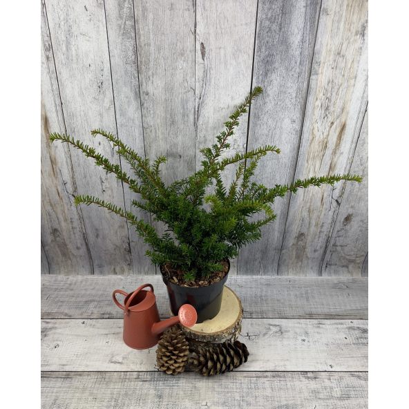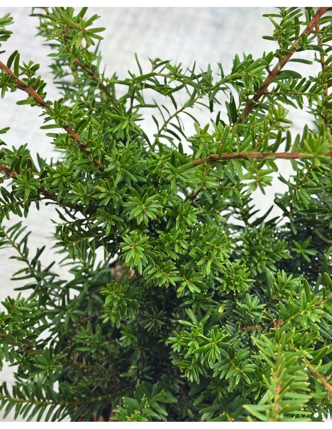 Zimozielony krzew o gęstym, płaskokulistym pokroju, charakteryzujący się pofalowanymi pędami i grzebieniasto ułożonymi, spłaszczonymi igłami długości do 2 cm. Odmiana męska – nie zawiązuje nasion.