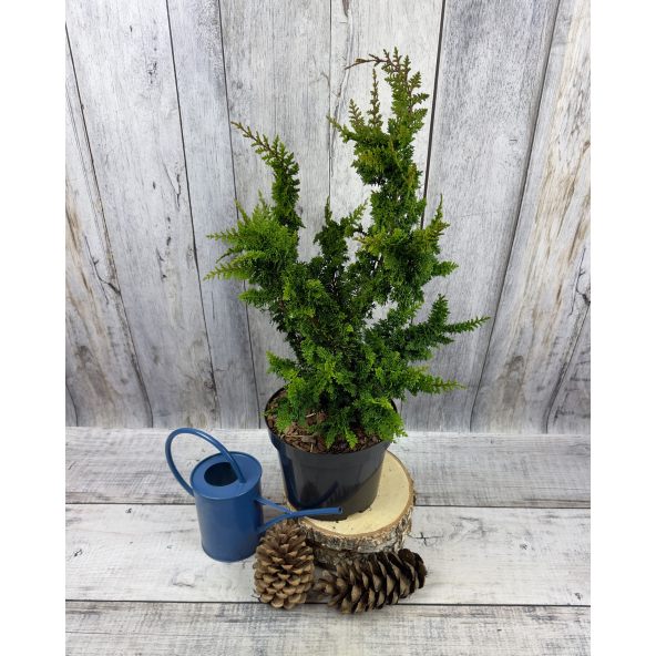 Boczne gałązki wyrastają ukośnie, a liczne drobne rozgałęzienia przypominają delikatne gałązki paproci, co nadaje roślinie lekkości i wyjątkowej struktury. Igły są jasnozielone, łuskowate, miękkie w dotyku, dzięki czemu krzew prezentuje się subtelnie i elegancko przez cały sezon.