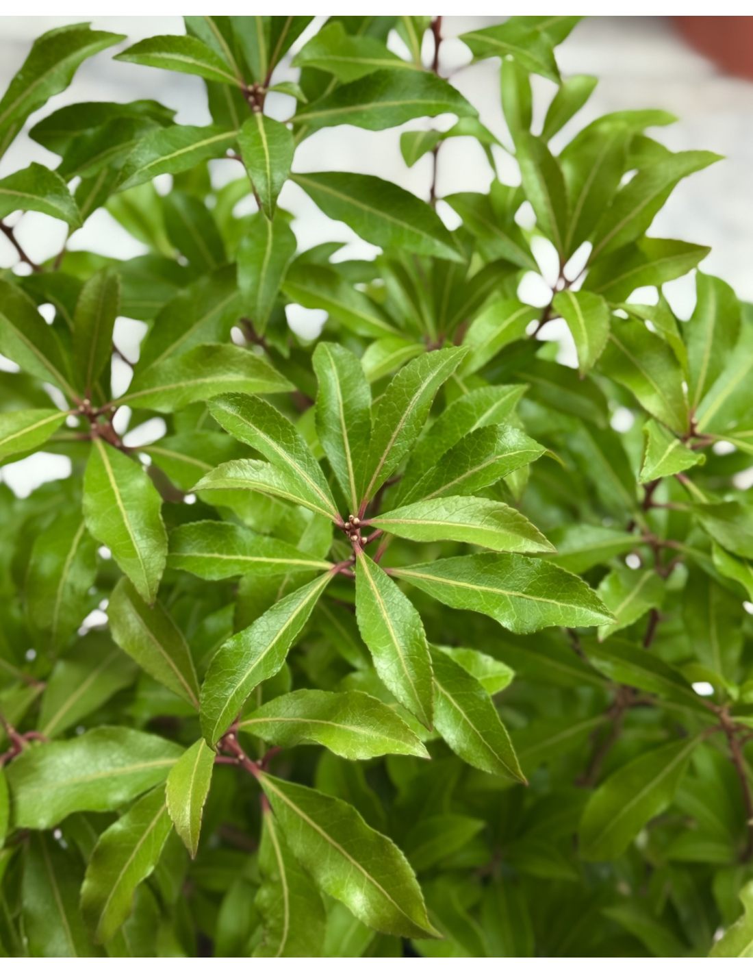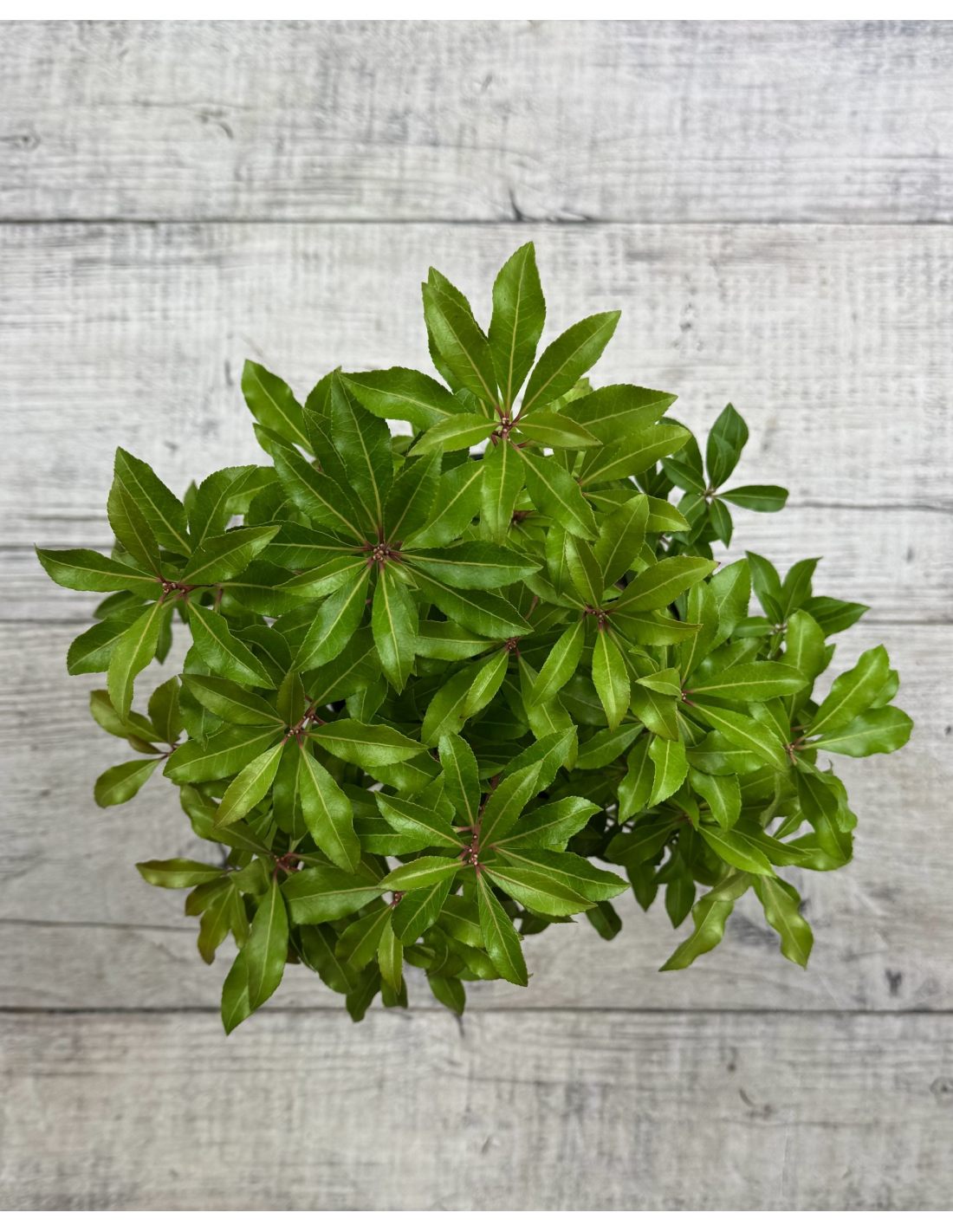 Zimozielony krzew o zwartym i gęstym pokroju, który po 10 latach osiąga wysokość 1–1,2 m. Liście są skórzaste, ciemnozielone i błyszczące, pod spodem jaśniejsze i matowe, zachowując dekoracyjny charakter przez cały rok.