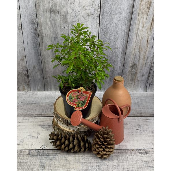 Zwarty, gęsty i kompaktowy krzew zimozielony, który przyciąga uwagę dzięki młodym przyrostom w intensywnym, soczystym odcieniu czerwonym. Pokrój bardziej zwarty niż u odmiany 'Mountain Fire’, co czyni go idealnym do małych ogrodów, rabat i dekoracyjnych nasadzeń.
