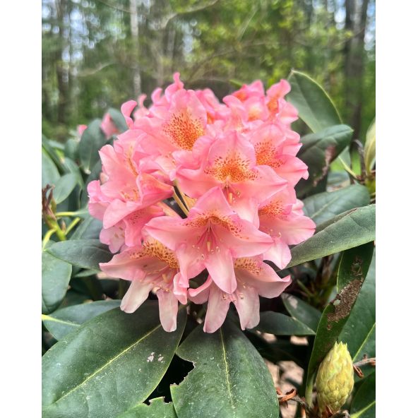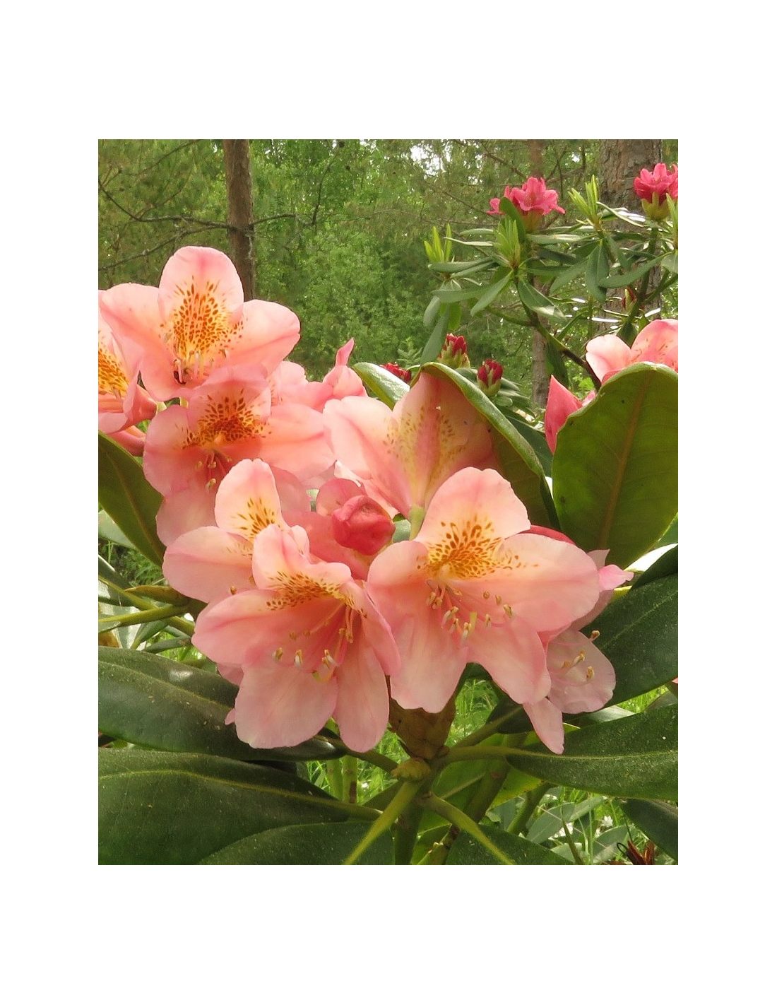 Wyróżnia się czerwonymi pąkami kwiatowymi i oryginalnymi, różowopomarańczowymi kwiatami z żółtobrązową plamką. Gęsto ulistniona odmiana o ciemnozielonych, dużych, odwrotnie lancetowatych liściach i zwartym pokroju. Rośnie wolno - po 10 latach osiąga wysokość 80 cm i 1,2 m szerokości. Kwitnie w maju. Mrozoodporność przynajmniej -30°C, niespotykana u odmian o tym kolorze kwiatów.