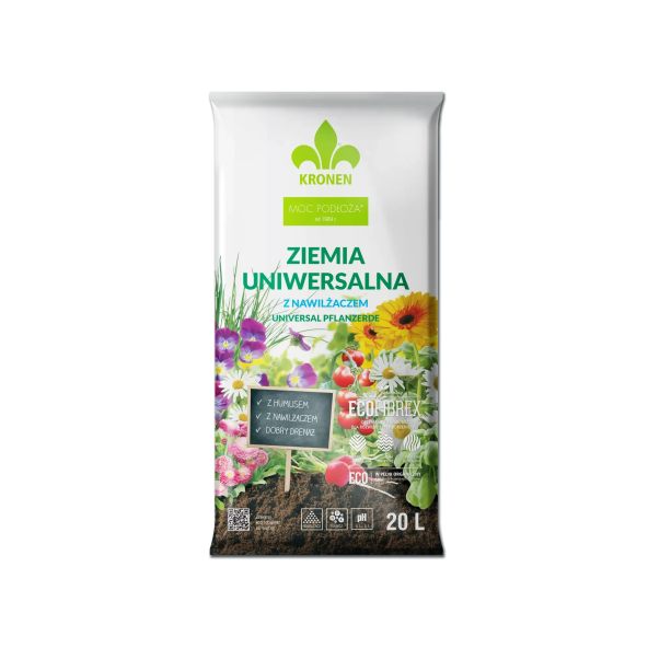 KRONEN® ziemia uniwersalna to wysokowartościowe, gotowe do użycia naturalne podłoże wyprodukowane na bazie torfu wysokiego o różnym stopniu rozkladu z dodatkiem włókien drzewnych ECOFIBREX®. Odpowiednie zestawienie tych dwóch komponentów pozwolilo na uzyskanie podłoża o lekkiej przewiewnej strukturze i dobrym drenażu. Struktura podłoża zapewnia równomierny, zdrowy rozrost bryty korzeniowej. Ziemia uniwersalna zawiera nawilżacz i nawóz z mikroelementami.