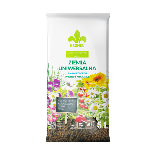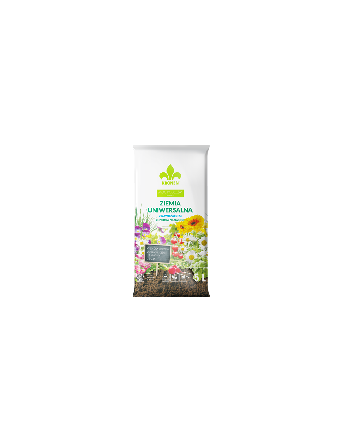 KRONEN® Ziemia uniwersalna z nawilżaczem jest przeznaczona do sadzenia i przesadzania wielu gatunków roślin zielonych i kwitnących, warzyw, ziół, bylin, iglaków w domach na balkonach, tarasach i w ogrodach, z wyjątkiem roślin kwaśnolubnych. Ziemia uniwersalna to wysokowartościowe, naturalne podłoże wyprodukowane na bazie torfu wysokiego o różnym stopniu rozkładu w oparciu o recepturę i doświadczenie profesjonalnych ogrodników. Ziemia uniwersalna zawiera nawilżacz i nawóz wieloskładnikowy z mikroelementami.