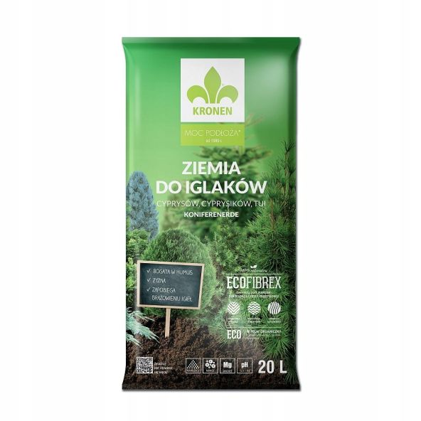 KRONEN®  Ziemia do iglaków wyprodukowana jest na bazie torfu wysokiego z dodatkiem włókien drzewnych ECOFIBREX®. Zestawienie odpowiednich frakcji tych komponentów pozwoliło na uzyskanie podłoża przepuszczalnego, sprężystego, a jednocześnie o stabilnej strukturze, odporniejszego na osiadanie i proces mineralizacji. KRONEN® Ziemia do iglaków zawiera powstały wyłącznie z elementów roślinnych kompost, który użyźnia w sposób naturalny podłoże, wzbogacając je w związki humusowe i próchnicze. KRONEN® Ziemia do iglaków zawiera startową dawkę wieloskładnikowego nawozu, wzbogaconego zwiększoną dawką magnezu (Mg), który przeciwdziała żółknięciu igieł.