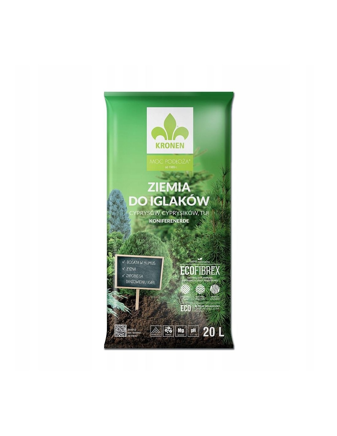 KRONEN® Ziemia do iglaków z włóknami torfowymi jest gotowym do użycia podłożem przeznaczonym do sadzenia i przesadzania roślin iglastych w pojemniki i w glebę. Podłoże wyprodukowane jest na bazie słabo i silnie rozłożonego torfu wysokiego, wzbogacone wieloskładnikowym nawozem. Dodane włókna drzewne ECOFIBREX® charakteryzujące się między innymi wolnym procesem mineralizacji powodują, że podłoże to jest stabilne i sprężyste o dużych przestrzeniach powietrznych.
