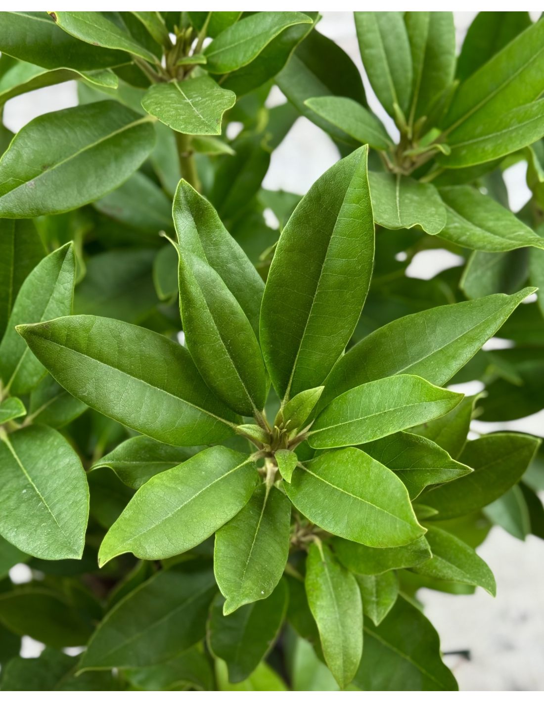 Liście są duże, eliptyczne, ciemnozielone, długości od 10 do 15 cm, stanowiące doskonałe tło dla intensywnie zabarwionych kwiatów.
